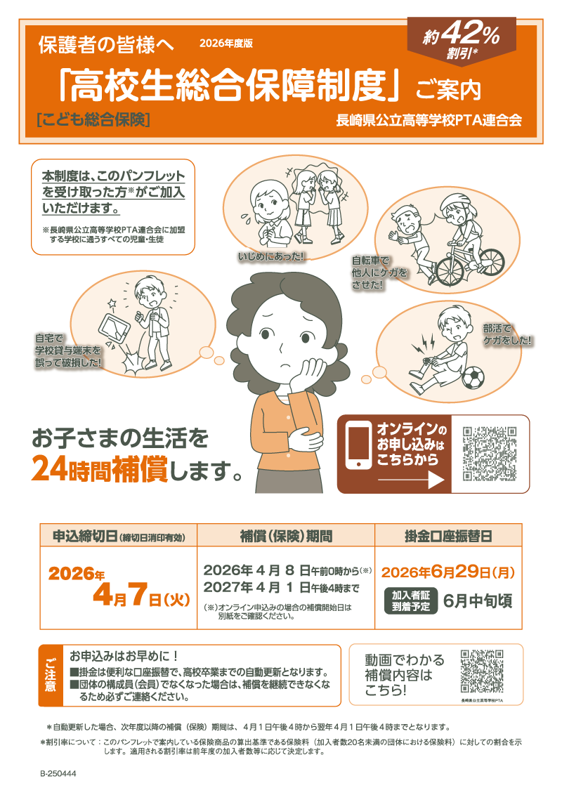 詳しくは下記の「高校生総合保障制度 ご案内」「高校生総合保障制度 補償概要」をご覧ください。